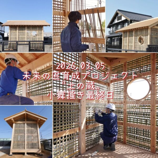未来の匠育成プロジェクト「土の蔵」建築。竹小舞掻きも、ひとまず区切りのところまで辿り着きました。