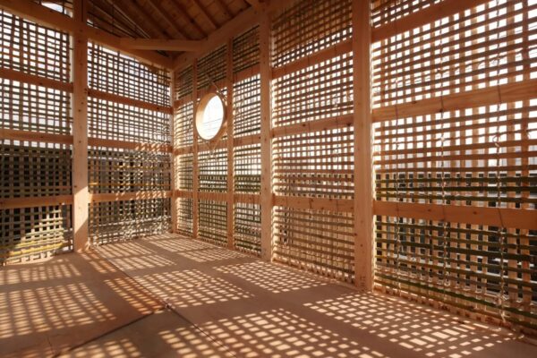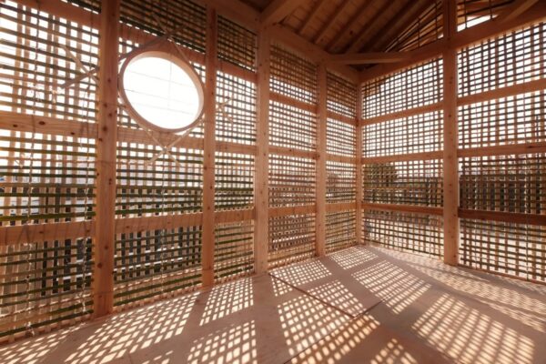 未来の匠育成プロジェクト「土の蔵」建築。若者たちが掻き終えた竹小舞に、やわらかな光が差し込み、美しい陰影が浮かび上がりました。