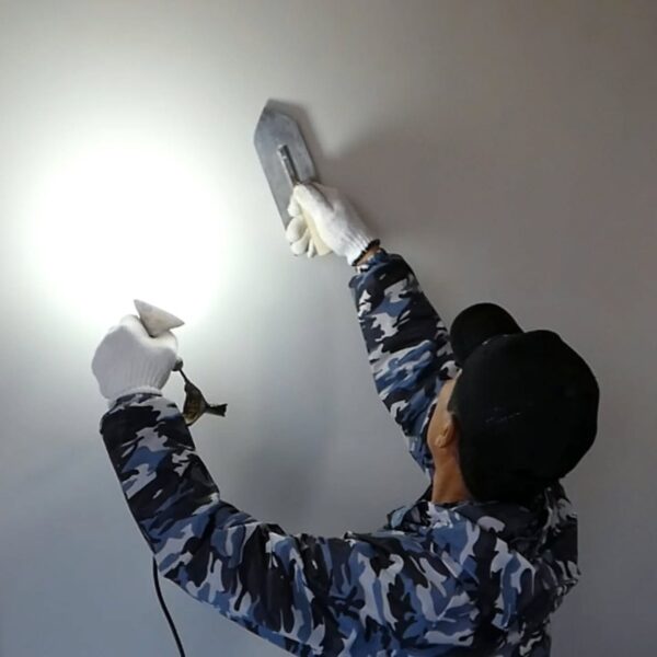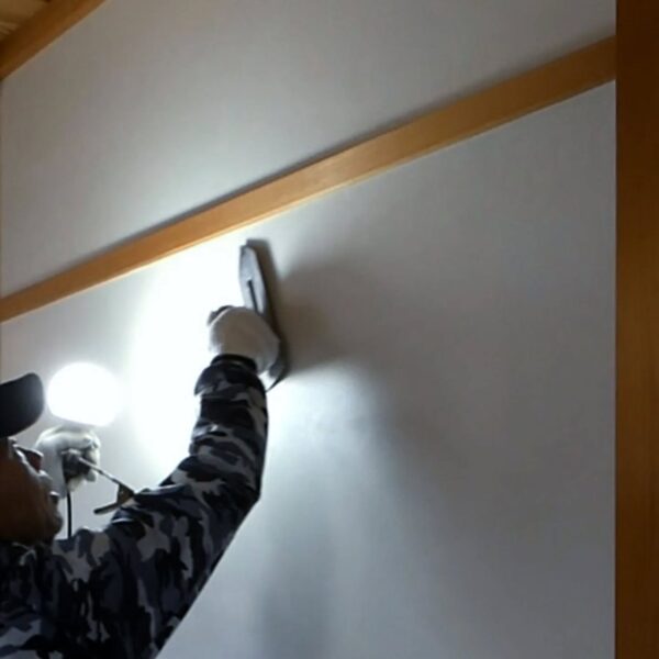 築18年のお住まい。経年で傷んだ聚楽壁を、漆喰壁(押さえ仕上げ)へと塗り替えています。奥深い純白の漆喰が、空間にやわらかな光を映し、清々しく明るい表情を生み出します。漆喰は、時を重ねるほどにゆっくりと硬くなり、住まいとともに味わいを深めていきます。