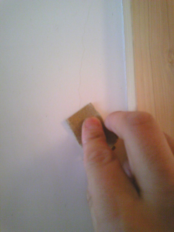 ①紙ヤスリで軽くなでるか、同じ調合仕上材でヒビを埋めます。