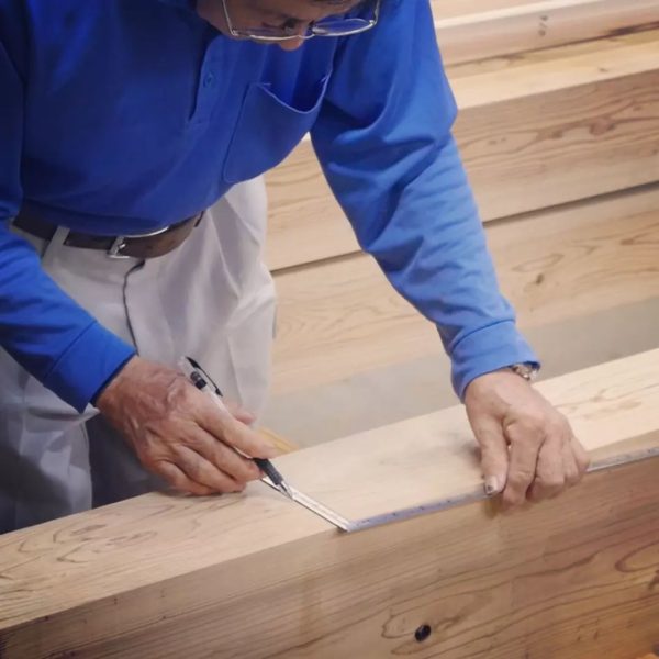 本日の刻工房、墨付け作業の様子です。柱や、土台、梁などに刻みの基準となる線や記号を付けています。上棟に向けて、真心を込めて作業を行っています。
