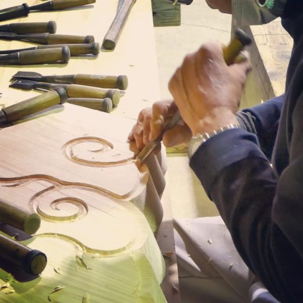 地元神社の建替工事における、彫刻作業の様子です。